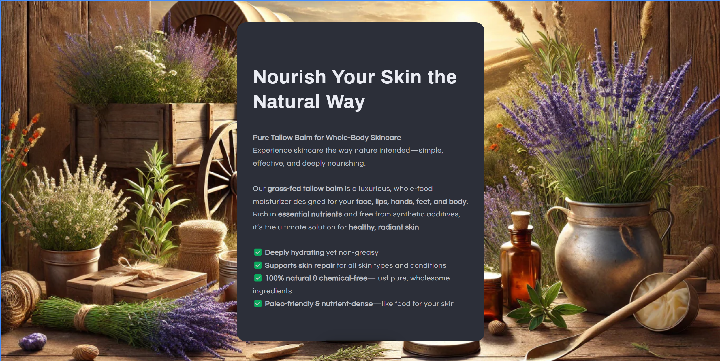 Used in healing balms, beauty routines, and everyday skin support, tallow delivers what modern products often promise but rarely achieve: deep, lasting moisture and true skin compatibility.