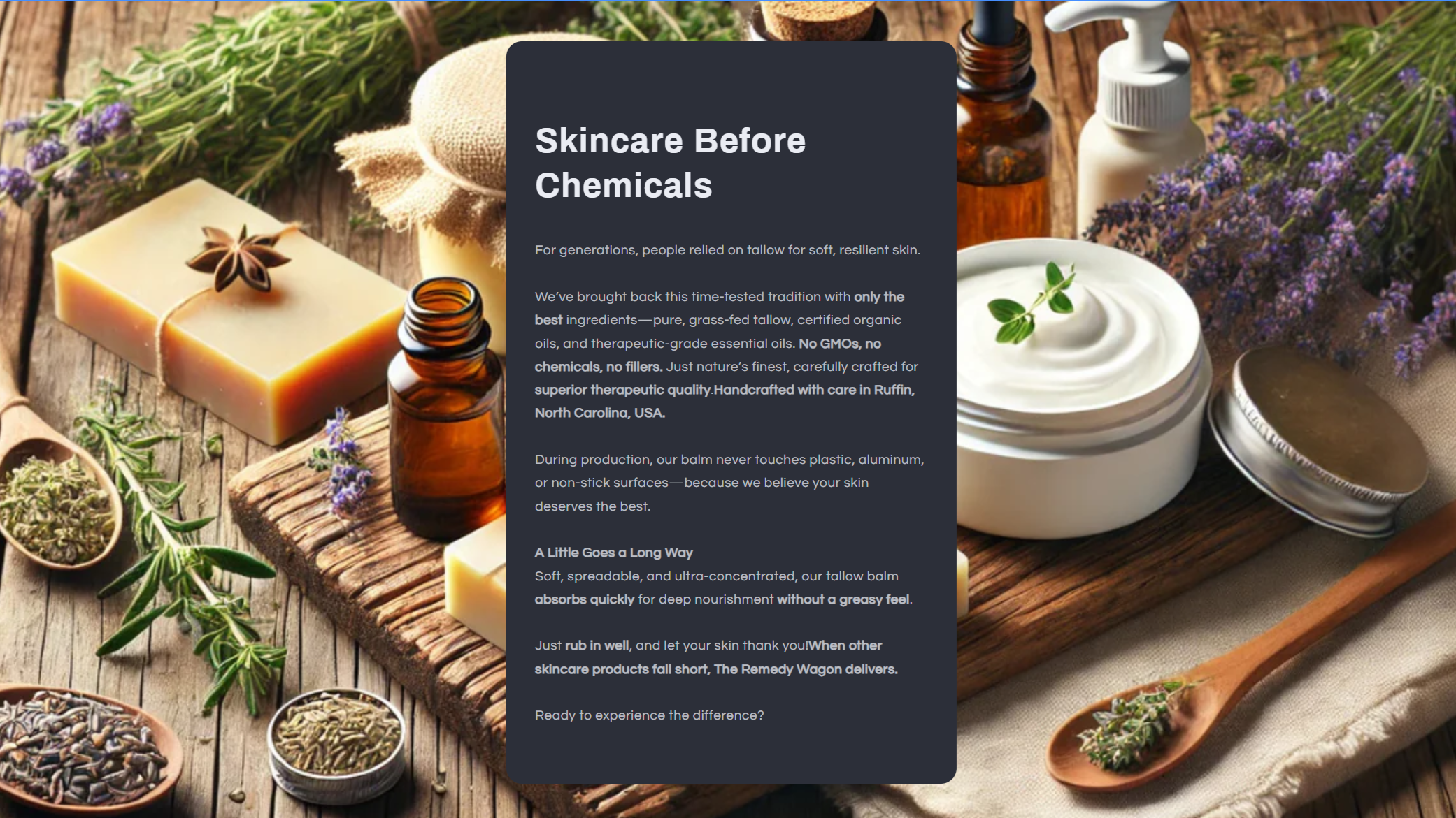 At The Remedy Wagon, we honor this age-old tradition using only 100% grass-fed and finished tallow — no fillers, no shortcuts. Just nature’s original moisturizer, gently rendered for easy application.